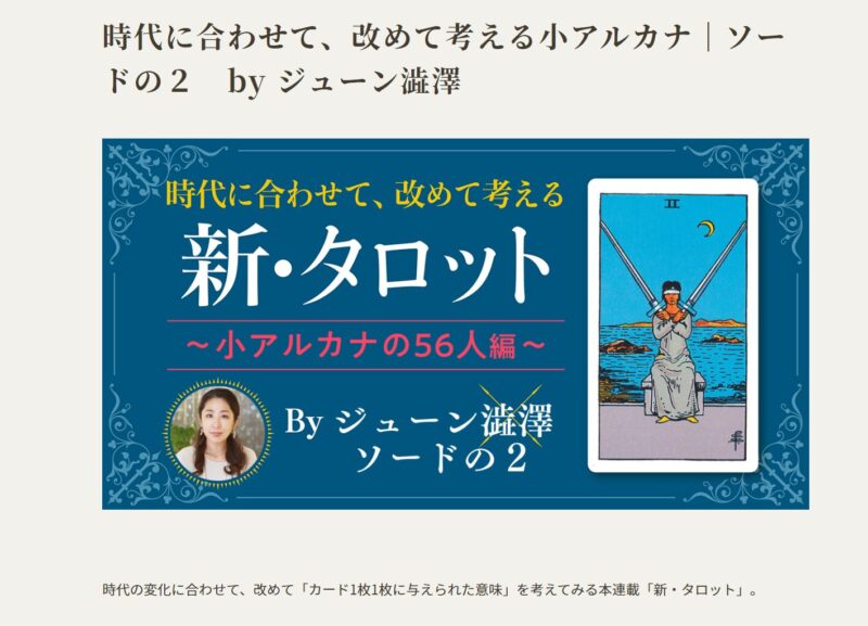 ◆2023年10月 日本で唯一の占い雑誌『MyCalendar(マイカレ)』の公式Webサイト「マイカレンダー」(説話社)で連載中の「新タロット~小アルカナの56人編~」に参加。『ソードの2』の新解釈の執筆を承りました。